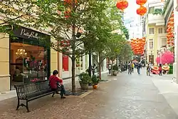 According to the press release of the Progress of Lee Tung Street Project announced by the then chairman of Urban Renewal Authority Cheung Chun Yuen, the new project would take the wedding industry as the main theme of the project since the original Lee Tung Street was famous for traditional wedding industry.[14] After redevelopment, H15 Concern Groups challenged the promise that making wedding as renewal theme as chain stores and famous brand dominated the new street. Due to the expensive rent, original shop owners can hardly move back. Also, tenants have to fulfill the term that building 'First Class Shopping Premises' which designed by URA and land developer. Nothing about the wedding theme has been mentioned in the lease.[15]