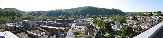 ![]() Panoramic view facing east showing approximately 180 degrees of downtown Leechburg from on top of the highrise located at 2nd and Main Street |