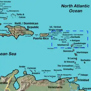 The Leeward Islands xeric scrub ecoregion (WWF ID: NT1310) covers the dry ('xeric'), non-forested areas of the Leeward Islands on the northeastern edge of the Caribbean Sea, stretching from the Virgin Islands in the west to Guadeloupe to the southeast. The non-forested areas are generally low scrub shrub, on the low elevations around the peripheries of the islands. Non-forested lower elevations in the region receive less rainfall and are typically semi-arid. A notable feature of the ecoregion is its position in the main hurricane track. The frequent damage to trees allows more pre-climax shrubs and trees to grow. There are a number of endemic species, as in common with islands.[1][2] [3] [4]
