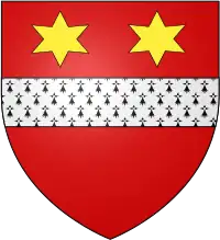 The coat of arms of the Craufurds of Lefnoreis was "Gules, a Fess Ermine, and in Chief, two Stars. Or."[15] This translates from heraldic terminology as a shield with a red background with a band of ermine running horizontally across and two gold stars above the horizontal band.