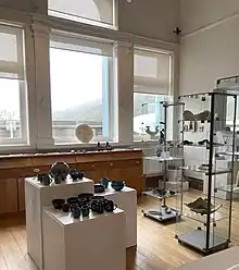 The permanent collection, a mixture of purchases and donations, includes works by Toss Wollaston, Allan Holcroft, Olivia Spencer-Bower, Yvonne Rust, Peter Hughson, Russell Beck, 1990 lithographs from Muka Studio, and contemporary pounamu.[1] The collection began with a Toss Wollaston drawing, Erua, gifted by the artist in 1985.[28] St Clair Sofield's watercolour South Tip Head was donated in August 1993,[29] and a Stanley Palmer monoprint Abandoned Buses, Millerton in 1996.[30] A Lotteries Commission grant at the beginning of 1995 allowed the gallery to build a temperature-controlled Conservation Room for its collection, at that point comprising 59 works valued at $50,000 (in 1996 dollars).[30]