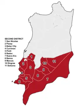 - Municipalities: Bacarra, Bangui, Pasuquin, Piddig, Sarrat (San Miguel), Vintar (re-established 1909), Burgos (Nagparitan) (re-established 1913), Pagudpud (established 1959), Adams (established 1983), Carasi (established 1983), Dumalneg (established 1983)
