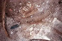 In 1952, Ed Lehner discovered extinct mammoth bone fragments on his ranch, at the locality now known as the Lehner Mammoth-Kill Site. He notified the Arizona State Museum, and a summer of heavy rains in 1955 exposed more bones. Excavations, led by William W. Wasley and Emil Haury, took place in 1955–56, and again in 1974–75. In the initial effort, thirteen fluted projectile points, with 2 damaged, and 8 stone tools were found as well as 9 mammoth remains, one bison, a horse, and a tapir. The Clovis points were of chert, clear quartz, and chalcedony. Two hearths were discovered and sampled for radiocarbon dating.[3][4][5][6][7] During the 1975 excavation the remains of a juvenile American Mastodon were found.[8]
