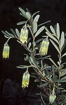 Leionema ralstonii is a small shrub to about 1 m (3 ft 3 in) high with smooth, substantially angular branchlets. The smooth leaves are sessile, about 30 mm (1.2 in) long, 8 mm (0.31 in) wide, smooth edges rolled under when dry, papery texture, with a slight notch at the rounded apex. The inflorescence is a tight cluster of 4-7 flowers at the end of branches. The smooth leaves are more or less lance shaped, broader at the apex, 2.5–5 cm (0.98–1.97 in) long, 5–8 mm (0.20–0.31 in) wide, gradually narrowing at the base, margins rolled under or upward when dry. The inflorescence is a compact cyme of 4-7 flowers at the end of branches, the stalk bent downwards, individual fleshy flower stalks are about 3 mm (0.12 in) long. The hemispherical calyx is smooth and fleshy with triangular shaped lobes. The flower petals are pale green, about 8 mm (0.31 in) long and stamens more than double the length of the petals. The dry fruit sits upright, 4–5 mm (0.16–0.20 in) long and ending in a short triangular point. Flowering occurs mostly in winter.[2][3]