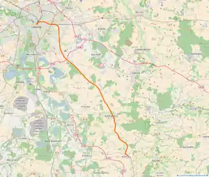 After options for upgrading the rail infrastructure between Leipzig and Chemnitz on the Leipzig–Neukieritzsch–Borna–Geithain–Chemnitz route had been examined several times between 2008 and 2012 and the announcement of the beginning of the preliminary planning for the upgrade of the line via Borna,[12][13][14] the state of Saxony and Deutsche Bahn signed a contract for the extension and electrification of the Chemnitz–Leipzig line in January 2013. Routes via both Bad Lausick and Borna were to be investigated.[15] As a result of the preliminary investigation, the route via Bad Lausick (and thus the inclusion of the Leipzig–Geithain railway) was selected as the preferred option. The main advantages of this option were a travel time of 50 minutes and convenient connections for passengers to the other long-distance lines in Leipzig Hauptbahnhof. In July 2013, the State of Saxony and Deutsche Bahn signed a planning agreement for the further upgrade and the electrification of the Leipzig–Chemnitz railway. The Free State of Saxony provided funding of around €2.4 million for this purpose.[16] The preliminary planning was completed in the summer of 2014 and presented to the public in August 2014.[17] In addition to the electrification, the restoration of the second track on the Leipzig–Geithain railway is also planned between Leipzig Werkstättenstraße and Liebertwolkwitz as well as four selective measures to increase the speed of the line. This includes track laying near Lauterbach-Steinbach station and the accompanying replacement of a level crossing by a road overpass.[18] According to media reports, commissioning is expected at the earliest after eight years.[19] The State of Saxony intends to commission the other projects in a timely manner and to finance them on a pro rata basis.[17] The project was nominated for the Federal Transport Plan (Bundesverkehrswegeplan) 2030.[11][17]