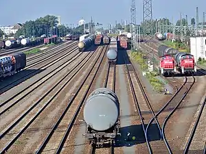 Leipzig-Engelsdorf marshalling yard (Bahnhof Leipzig-Engelsdorf) is the central marshalling yard in the Leipzig rail node in the German state of Saxony. Until it was closed in 1994, there was also a marshalling yard at Leipzig-Wahren station. It is located on the Leipzig–Dresden, Engelsdorf–Leipzig-Connewitz and Leipzig-Wahren–Engelsdorf railways in the Leipzig suburb of Engelsdorf. The halts of Leipzig Werkstättenstraße (on the Leipzig–Geithain railway) and Leipzig-Engelsdorf Hp (Haltepunkte, on the Leipzig–Dresden railway) are located in the marshalling yard area. It was called Bahnhof Engelsdorf (b Leipzig) until December 2016.
