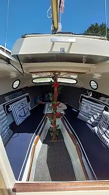 The cabin is just a single room. The seats placed in the saloon provide two bunks. Two additional bunks can be found below the cockpit seats. The Leisure 17 was designed as a 4-person cruiser, but just two crew will fill the available storage and sleeping space. Although the boat is only 17 feet overall, it is equipped with a small galley and a chemical toilet.