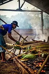In Indonesia, lemang is associated with Minangkabau tradition of West Sumatra.[2][11] Nevertheless, rice cooking method using bamboo tubes is widespread in the region, including Brunei,[12] Minahasa, Dayak and Orang Asli tribes. The Minahasan version of this dish is known as Nasi Jaha, which is cooked in the same method.[13]