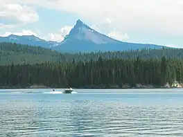 ![]() A boat tows a water skier on Lemolo Lake. Mount Thielsen is in the background. | |