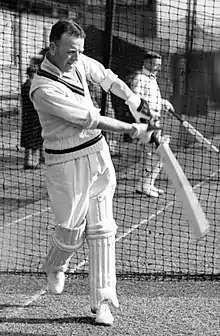 1934 was Hopwood's greatest year, however. His batting was not quite so good as in 1933, but with 220 against Gloucestershire and his skill as a bowler he was seen as too good to miss a place in the Test team. However, with the likes of C.F. Walters and the incomparable Herbert Sutcliffe to fill Hopwood's natural place as an opener, there was little hope he would be successful trying to play a game foreign to his nature. As for his bowling, nobody believed he could get wickets against batsmen with the superlative footwork of Bradman, Kippax or Ponsford on good pitches, whilst on bad pitches Verity would – as at Lord's – do everything that was required. Thus it was unsurprising when Hopwood scored only twelve runs in two innings and set a record for bowling the most balls in Test cricket (462) without taking a wicket.[1] His economy in the Old Trafford Test on a featherbed pitch, however, drew praise form the critics even if it was clear he did not have Verity's cleverness. Nonetheless, for Lancashire Hopwood had three deadly matches on worn or sticky pitches: