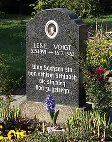 Lene Voigt lived at the hospital in Leipzig-Dosen for thirteen years. She was regarded as a reliable employee. The only wish she expressed consistently was that she might end her days at the Fritz Austel Retirement Home. The hospital management backed her in this. However, on 16 July 1962 she died in the hospital wing of the District Psychiatric Clinic. Her death was almost entirely overlooked at the time when it happened, apart from a two line announcement in the local newspaper. It was only in 1985 that a gravestone was placed over her grave, and only in 2002 that her remains were disinterred and reburied with other distinguished citizens in the "Artists' Section" ("Künstlerabteilung") of the Leipzig Südfriedhof (South Cemetery).[1]