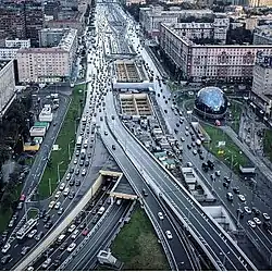 After crossing Small railway ring Leningradskoye Highway enters Golovinsky District. There is an interchange with Golovinskoye Highway near Vodny Stadion metro station. Until 2008 this crossing was served by traffic lights. That was the last traffic light on the highway.