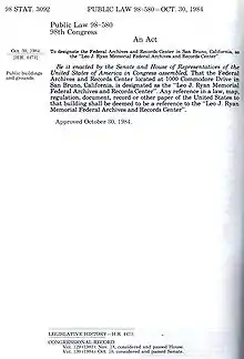 Congressman Tom Lantos introduced a bill in 1983 in the United States Congress: ..to designate the Federal Archives and Records Center in San Bruno, California as the "Leo J. Ryan Memorial Federal Archives and Records Center".[12] The bill passed by unanimous consent in the House of Representatives and Senate, and was signed by President Ronald Reagan and became public law 98-580 on October 30, 1984.[12]