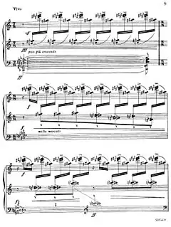 Before the turn of the decade—probably in 1918 or 1919—Ornstein produced one of his most distinctive works involving tone clusters, Suicide in an Airplane.[29] Its score calls for a high-speed bass ostinato pattern meant to simulate the sound of engines and capture the sensation of flight.[30] The piece would serve as an inspiration for the Airplane Sonata (1923) of George Antheil, who reflected Ornstein's influence in other works such as Sonata Sauvage (1923).[31] Writing in 2000, pianist and historian Joseph Smith cited Suicide in an Airplane among those pieces of Ornstein's that "represented (and may still represent) the ne plus ultra of pianistic violence."[32]