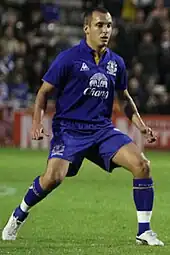 He was loaned to Carlisle United of the Third Division in October 2002, making his first-team debut on the 5th by playing the full 90 minutes of a 2–1 home defeat to Torquay United.[7] He scored once for the team in a league fixture against Macclesfield Town on 19 October to ensure a 2–2 draw at Moss Rose,[8] and twice against Oldham Athletic in the Football League Trophy three days later in a 4–3 away victory.[9] On returning to Everton in January, he made his Premier League debut in a 4–3 defeat at Tottenham Hotspur on 12 January 2003, replacing Li Tie in added time.[10] His only other Everton appearance of the season was his Goodison Park debut on 26 April, replacing Steve Watson at the end of a 2–1 win over Aston Villa.[11]