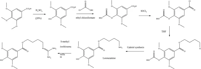 Leonurine can be synthesized starting from eudesmic acid. Reaction with sulfuric acid produces syringic acid. Protection with ethyl chloroformate followed by reaction with thionyl chloride SOCl2 and then tetrahydrofuran yields 4-carboethoxysyringic acid 4-chloro-1-butyl ester. The chloride is then converted to an amino group via a Gabriel synthesis (with potassium pthalimide) followed by hydrazinolysis (Ing–Manske procedure). The final step is reaction of the amine with S-methylisothiourea hemisulfate salt.