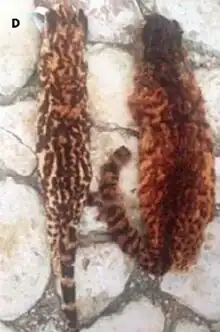 The red tigrina is classified as a member of the genus Leopardus, the small spotted cats of South America.[1]