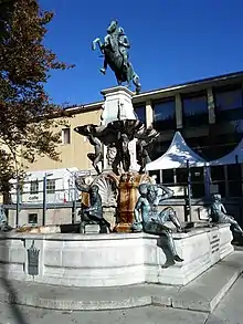 The Leopold Fountain (German: Leopoldsbrunnen, more rarely Leopoldbrunnen) in the Tyrolean state capital is a listed monument near the Altstadt of the city of Innsbruck. The fountain, which is on the Rennweg and is not far from the Tyrolean State Theatre features an equestrian statue of Archduke Leopold V who lived from 1586 to 1632 and gave the fountain its name.