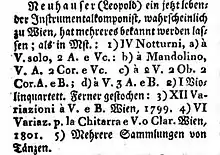 Bone also wrote of Neuhauser's "many unpublished manuscripts for the mandolin and guitar and also four instrumental nocturnes"[1] Konrad Wölki wrote of Neuhauser's four "Notturni for mandolin, violin, two horns and violincello" which were published in handwritten-manuscript form by Johann Traeg, 1799, Vienna.[3]