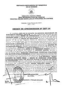 - ↑ "Opositor Leopoldo López con orden de captura por 'terrorismo'". El Universo. 14 February 2014. Retrieved 21 February 2014.