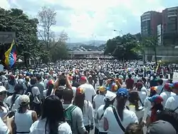 The Economist reported in February 2014 that while Henrique Capriles headed the moderate wing of Democratic Unity Roundtable (MUD) – the alliance of Venezuelan opposition parties – López headed "the more confrontational wing". Both advocated nonviolence, while López, unlike Capriles, "believe[d] that demonstrations can prompt a change of government".[94] On 12 February 2014, López called on Venezuelans to peacefully protest against the Venezuelan government.[11] The same day, Venezuelan prosecutors, after likening López and protesters to "Nazis",[95] issued an arrest warrant for López on charges including instigation of delinquency, public intimidation, arson of a public building, damage to public property, severe injury, "incitement to riot", homicide, and terrorism.[96][97]