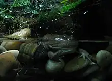 Lepidobatrachus llanensis is an aquatic frog inhabiting dry scrubland and semi-arid areas at elevations below 300 m (980 ft). Breeding takes place in temporary pools and water tanks on cattle farms. During the dry season these frogs burrow underground, only to emerge again after rain.[1] To deal with dry conditions, they form a protective cocoon[1][3] that greatly reduces the loss of water.[3]