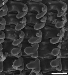 The large main cusp of the central tooth of radula is accompanied by prominent ectocones. The 7-8 adjoining lateral teeth in half a row have equally small ectocones. All these teeth have prominent basal plates with interrow support ridges. In the first marginal tooth, the main cusp is less symmetrical and the basal plate is less prominently developed. The following c.10 marginal teeth are increasingly more asymmetrical initially, with an endocone on the main cusp and ectones with two or three cusps in the teeth closer to the margin, which are irregularly comb-like when the main cusp with the endocone becomes relatively smaller.[1]