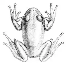 Males measure 33–35 mm (1.3–1.4 in) (30–36 mm according to Rödel[5]) and females 42–48 mm (1.7–1.9 in) in snout–vent length. The dorsum is smooth and brown with a darker pattern, normally consisting of an occipital bar and an 'n'-shaped dorsal marking. Also a green specimen without a dark lateral stripe has been photographed. This suggests that a green phase may be present in this species. Indeed, the specific name viridis suggests that the type specimen had been green in life.[4] Males have dark, almost uniform black throats. There is no webbing on hands and the webbing in feet is reduced.[5]