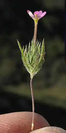 The tip of the stem has an inflorescence of one or more flowers each with a long, hairy tube up to 2.5 centimeters long emerging from the leaf-like sepals. The face of the flower is less than a centimeter wide and pale to bright pink with white and yellow coloring and reddish spots on the throat. The bloom period is March to July, depending on altitude and latitude.