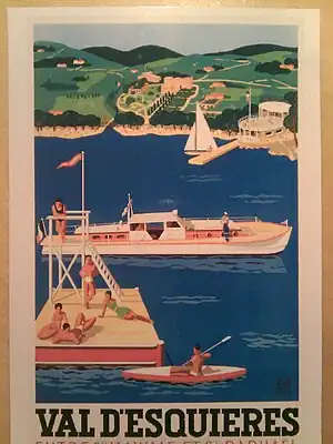 The seaside and holiday destination of the commune of Roquebrune-sur-Argens, France stretches along 8 km of inlets and fine sandy beaches. Its incarnation as a resort took place in the 1930s with the development of Hotel La Résidence (now named Hôtel club Vacanciel des Issambres) above La Garonette Beach. Clearly conspicuous from the sea, it is located in the Val d' Esquieres, which Les Issambres shares with the commune of Sainte Maxime. Eastwards on the beach is the sailing center with boat rentals and a sailing school, a protected boat harbour with some marine shops, dive center and restaurants. There is a ferry (Les Bateaux Verts) that takes passengers to the Sainte Maxime harbour or Saint Tropez.