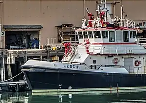 The ship's principal fire suppression equipment comes in the form of four 5,000-US-gallon (19,000 L; 4,200 imp gal) per-minute water pumps. In addition to pumping water, the ship's firefighting apparatus can tap an integrated 6,000-US-gallon (23,000 L; 5,000 imp gal) foam tank for use against chemical-fueled fires.[2] Leschi also has a 55-foot (17 m) telescoping crane with ladder and fire line for use against container ship fires and the ship is able to douse itself with a cooling fog to allow for operation directly adjacent to a major fire.[2][11]