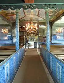 The pulpit in Lesja Church is richly carved with acanthus decorations and was created by Jakob Klukstad in 1742-1745 (this was in the old church for a few years and then moved to the new church when it was built).[3] Klukstad was from Lom but he moved to Lesja and was the head of the household at the parsonage farm, probably at the time he was working on the church. The pulpit was made for the previous church that stood at the site. Klukstad also created the altarpiece for the new church, which has a very original design. It is a large and richly executed work of art with a framework of acanthus surrounding several carved figures.[5] The altarpiece is a masterpiece of folk art in the region. The ceiling painting in the church and the painting on the sides of the galleries and box pews were created by Ragnvald Einbu based on a model from preserved remnants from the church's original decor.[3]