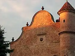 The building was constructed in the mannerist-early baroque style with characteristic gables decorated with volutes and stone baroque vases.[3] Some of the elements are gothic - buttresses, tower. The façade bears a Hebrew inscription that reads, in translation: "He was afraid and said, 'How awesome is this place! This is none other than the house of God; this is the gate of heaven'" (Genesis 28:17).[4] The interior was adorned in mannerist style with niches, cornices and architraves.[2]