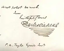 Dickens received, by his own count, 60 to 80 letters every day, and when pressure of work permitted he replied to them without delay.[3] For most of his life he did not employ a secretary but conducted his correspondence himself. Exceptions were made for begging letters, which his sister-in-law Georgina Hogarth answered, and for routine business connected with his two magazines, Household Words and All the Year Round, which was handled by his assistant editor W. H. Wills, although Dickens preferred to correspond with the contributors himself.[4][5] He wrote with a goose quill rather than a steel pen, and at first used black ink (now aged to brown), switching in the late 1840s to blue ink on blue paper.[6] His biographer Fitzgerald described his handwriting as "so 'prompt', so alert, finished and full of purpose and decision; legible also, but requiring familiarity and training to read". He often ended his signature with an exuberant flourish, which became a kind of trademark.[7]