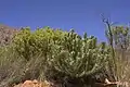 The shrub grows 2.5 m tall and flowers from June to October but mainly in July. The plant dies in a fire but the seeds survive. The seeds are stored in a toll on the female plant, first fall to the ground after a fire and are spread by rodents. The plant is unisexual and there are separate plants with male and female flowers, which are pollinated by small beetles. The plant grows mainly in sandstone and quartzite soils at altitudes of 60–1700 m.