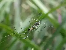 - 1 2 Briceño, R. D.; Eberhard, W. G. (2011). "The hub as a launching platform: rapid movements of the spider Leucauge mariana (Araneae: Tetragnathidae) as it turns to attack prey". The Journal of Arachnology. 39 (1): 102–112. doi:10.1636/Hi10-76.1. ISSN 0161-8202. JSTOR 23048786. S2CID 43984275.