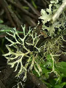| Leucodermia leucomelos is the prominent lichen on the lower left | |
