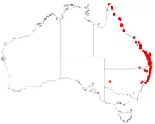 This leucopogon grows in coastal heath and open woodland in Queensland to as far south as Hawks Nest on the north coast of New South Wales.[2]