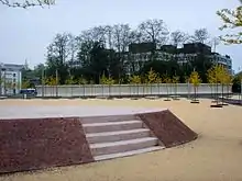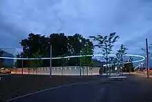 The park is full of wide gravel and grass areas that are partly planted with trees. The white concrete sitting wall which encircles the bullet catcher for the former shooting range forms a giant, 155-m-long «tree pot» which gives the site its particular character. The bench that runs around is integrated in the wall and is illuminated at night.[4] The randomly placed Gleditsia provide an airy atmosphere with their slender, light green foliage. The park is complemented with a pool, stage, and a play area.[5] The blue Leutschen light that shines at night floats between the treetops. The light installation, which was developed by the artist Christopher T. Hunziker provokes memories of the Leutschenbach stream which flows under the surface and accompanies the visitors on their stroll through the park. A small fountain provides the soundtrack for this.[6]