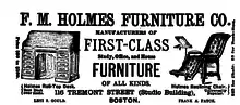 In 1866 Gould became connected with the F. M. Holmes & Company.[9] F. M. Holmes & Company, was a business that manufactured and sold furniture.[9] 1878 Gould purchased F. M. Holmes and Company[9] and ran it as the F. M. Holmes Furniture Company.[9] The F. M. Holmes Furniture Company factory was in Charlestown, and its warehouse and salesroom was in Boston.[9]