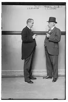 After his first wife's death in 1905, he sold their home at 2 East 87th Street and took an apartment in the Tiffany Apartment at 27 East 72nd Street. On June 6, 1906,[9] he married Frances Isabel Morris, the divorced wife of Thurlow Weed Barnes, brother of photographer Catharine Weed Barnes and grandson of publisher Thurlow Weed.[7] She was a daughter of John Albert Morris, a prominent figure in the sport of thoroughbred horse racing, and a sister of Alfred Hennen Morris and Dave Hennen Morris,[7] and had two daughters, Jean Morris Barnes (1893-1963),[13] who married Mansfield Ferry (1882–1938),[14] and Muriel Hennen Morris, who first married Barrington Moore Sr. (1883-1966), in 1910,[15][16] and later, Richard L. Stokes (1883-1957),[17][18] in 1929.[19]