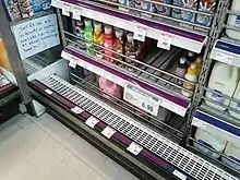 This shortage prompted local supermarkets and retailers to take extreme measures to secure stock and ensure fair purchasing. In some cases, rationing was implemented so as to limit the purchase to two bottles per person, and security guards were hired to monitor shoppers and fridges containing chocolate milk.[10][11] The shortage also resulted in the emergence of chocolate milk black markets, ranging from scalpers attempting to resell bottles on TradeMe at three to four times their original price to counterfeit chocolate milk production.[12]