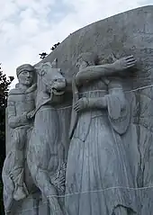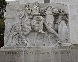 Leo Friedlander's Lewis and Clark (1934) is a high relief carving depicting Meriwether Lewis and William Clark of the Lewis and Clark Expedition on horseback, being led by Sacajawea, located outside the Oregon State Capitol's main entrance.[1] The white Vermont marble sculpture, carved from a block made of six smaller pieces, measures approximately 153 inches (3.9 m) x 18.5 inches (0.47 m) x 8 feet (2.4 m) and rests on a granite base that measures approximately 51 inches (1.3 m) x 19.5 feet (5.9 m) x 90 inches (2.3 m).[1] On the back is a map illustrating the area covered by Lewis and Clark and depictions of both hunting and meetings with Native Americans. The installation also includes a signed inscription that reads "LEO FRIEDLANDER" on the lower left and "WESTWARD THE STAR OF EMPIRE TAKES ITS WAY" across the base.[1]