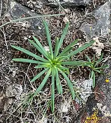 Lewisia rediviva is a low-growing perennial plant with a fleshy taproot and a simple or branched base and a low rosette of thick fleshy linear leaves with blunt tips. The leaves are roughly circular in cross section, sometimes somewhat flattened on the adaxial (top) surface. The absence of an adaxial groove on the leaves distinguishes this from other Lewisia species with overlapping ranges. The leaves often wither before flowers open.