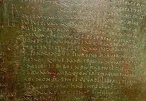 Lex Malacitana or Lex Flavia Malacitana ("Flavian law of Malaca") is a bronze tablet bearing Latin local statutes which deal with the official activities of the duoviri iuri dicundo.[1] The tablet was found in the 20th century near Malaca (modern Málaga) with the lex Salpensana,[2][3] and it was dated from AD 81–84, i.e. the early reign of Domitian.[4] Malaca was governed under this law, which granted free-born persons the privileges of Roman citizenship.[5]