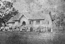 On 22 January 1865 the purpose-built school house was opened. Funded by a combination of local subscriptions and Board moneys, the school was erected on the eastern side of the existing school site bordering a narrow lane. At this time the school site consisted of blocks 8 and 9 (block 7 bordering Canning Street being added in 1945). The new school house was, in the style of the time, a low set building. It contained a single large school room and an adjoining smaller class room with the main entry by way of a covered porch. A verandah appears to have been added to the rear at a later date. Contrary to the Board of Education's recommendations, and owing to cost and time factors, the school was built not of brick but of timber (cypress pine). Soon afterwards, in fact, architect Richard George Suter was to convince the Board of the utility of timber schools and a number were to be erected throughout Queensland.[1]