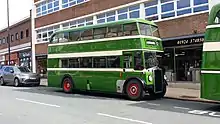 • PD1/3: In Autumn 1946, the Construction and Use regulations were revised, allowing a maximum width for buses of 8 ft (2.4 m), rather than the previous 7 ft 6 in (2.29 m), provided the Traffic Commissioners approved the use of wider buses on routes, in the same way as they already had the power to approve double-deck buses on a route-by-route basis. Also, the gross vehicle weight for a double-deck bus was increased to 12 tons, from the wartime figure of 11 tons. The PD1/3 differed from the PD1 in that it had wider axles, being designed for the 8-foot width. Oldham Corporation quickly obtained clearance for all their routes and in 1947 DBU244 with Charles H. Roe H31/25R body became the first 8-foot-wide motorbus built for service in the UK.[20] Oldham took in total 50 similar buses in 1947/8. Manchester Corporation were also early customers for the wider bus, following up their initial 1946 batch of fifty PD1s with a 1947/8 order for 100 PD1/3 with 58-seat (H32/26R) bodies to their standard outline by Metro-Cammell. During 1948 Ribble Motor Services, who had obtained permission to use full-width double-deck coaches on their express services from East Lancashire to Blackpool, received 30 such bodies by H. V. Burlingham of Blackpool, which had full-width cabs, electrically powered folding doors to the rear platform, which itself was built-up to saloon level, allowing a small luggage boot. The body design, with additional luggage stowage over the rear wheel arches, had generously radial windows, two sunroofs on the upper deck and, although of lowbridge layout (the Leyland patent on this expired in 1937), were fitted out to full coach standards for 49 passengers (FCL27/22RD). Liberal use was made of chromium-plated steel trim and they carried the cream coach livery, with red relief, rather than the bus livery of red with cream relief, they soon became famous as the "White Ladies"[23] was so successful that a further twenty similar vehicles on PD2/3 chassis with East Lancashire Coachbuilders bodies, were added in 1951.