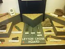 A small collection of Early Middle Bronze Age (c. 13th Century BC) tools and weapons, dubbed the Leyton Cross Hoard, was found in the garden of a house at Tredegar Road, Leyton Cross, 120 metres east of the present boundary with Dartford Heath.[1] It was discovered by the owner of the property Mr John (Jack) Oliver whilst excavating the foundations of a home extension in 1986.[2] The hoard comprises two axe-heads, a razor and a knife.