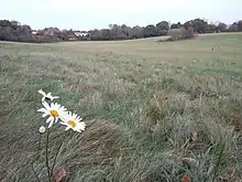 During World War II an army camp was located on the heath; its main gate at Leyton Cross. A Royal Artillery anti-aircraft regiment was based there, and their dispatch riders would train by riding their motorbikes over the network of sand banks known locally as the Glory Bumps.[19] Anti aircraft guns were installed on Dartford Heath north of Leyton Cross;[20] a notice board was erected showing the number of enemy aircraft they had shot down. After the war the army huts were used to house displaced families. Some of the camp's tarmac road surfaces are still visible on the heath.