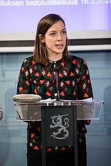Li Sigrid Andersson[2] (born 13 May 1987)[3] is a Finnish politician who served as Minister of Education from 2019 to 2023.[4][5] The leader of the Left Alliance, she has been a Member of Parliament since 2015. She is also the city councilor of Turku and was the chair of the party's youth wing, Left Youth.